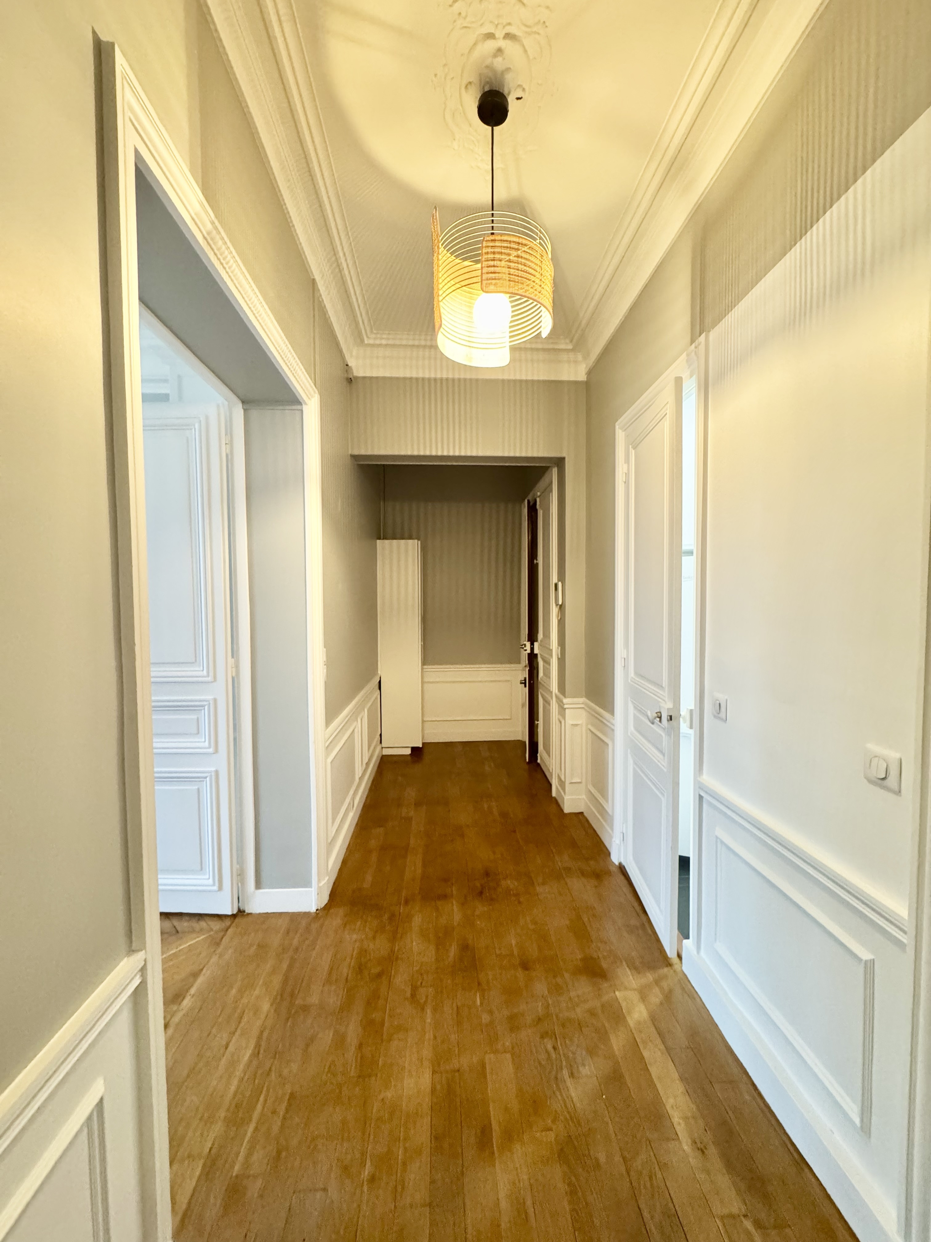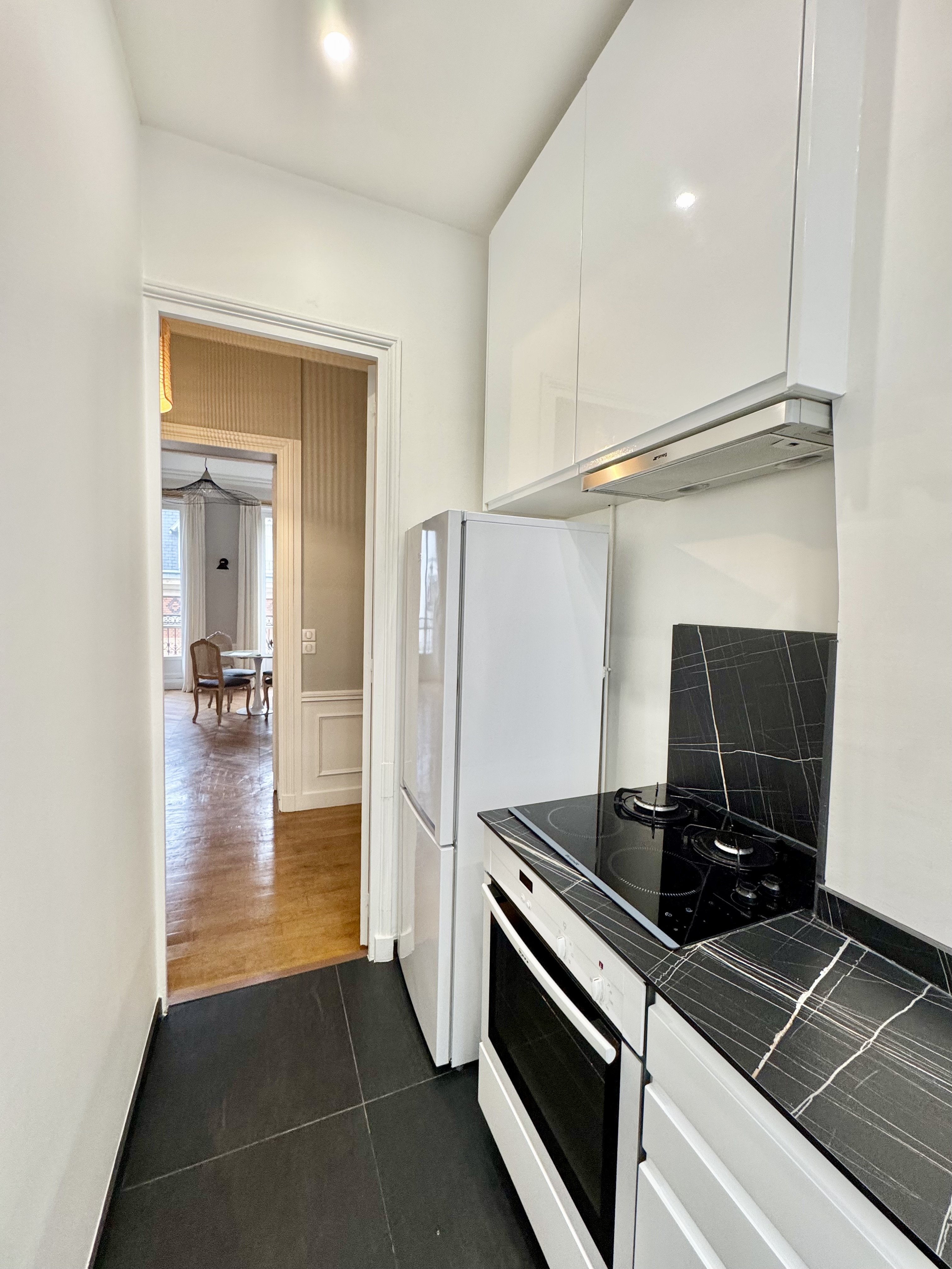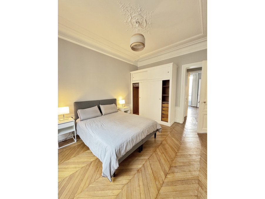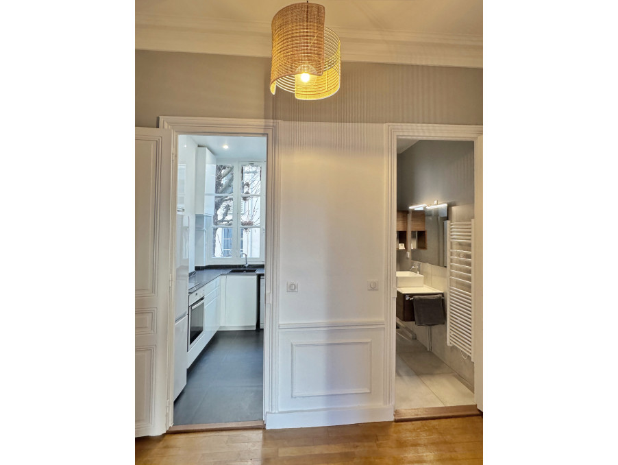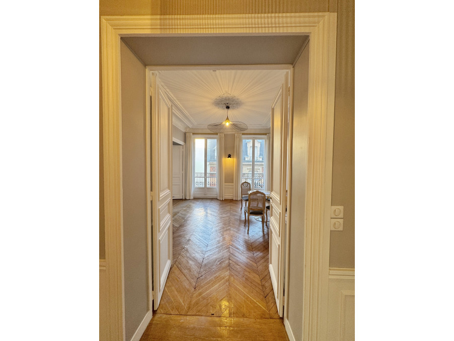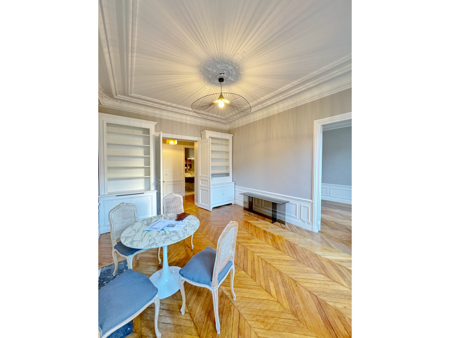 3 pièces de 68 m2 composé d'une galerie d'entrée, un séjour avec balcon sur l'impasse, une cuisine toute équipée, deux grandes chambres avec placards et dressing, une salle de douche avec machine LL et sèche linge + WC. Parquet, moulures, belle hauteur sous plafond