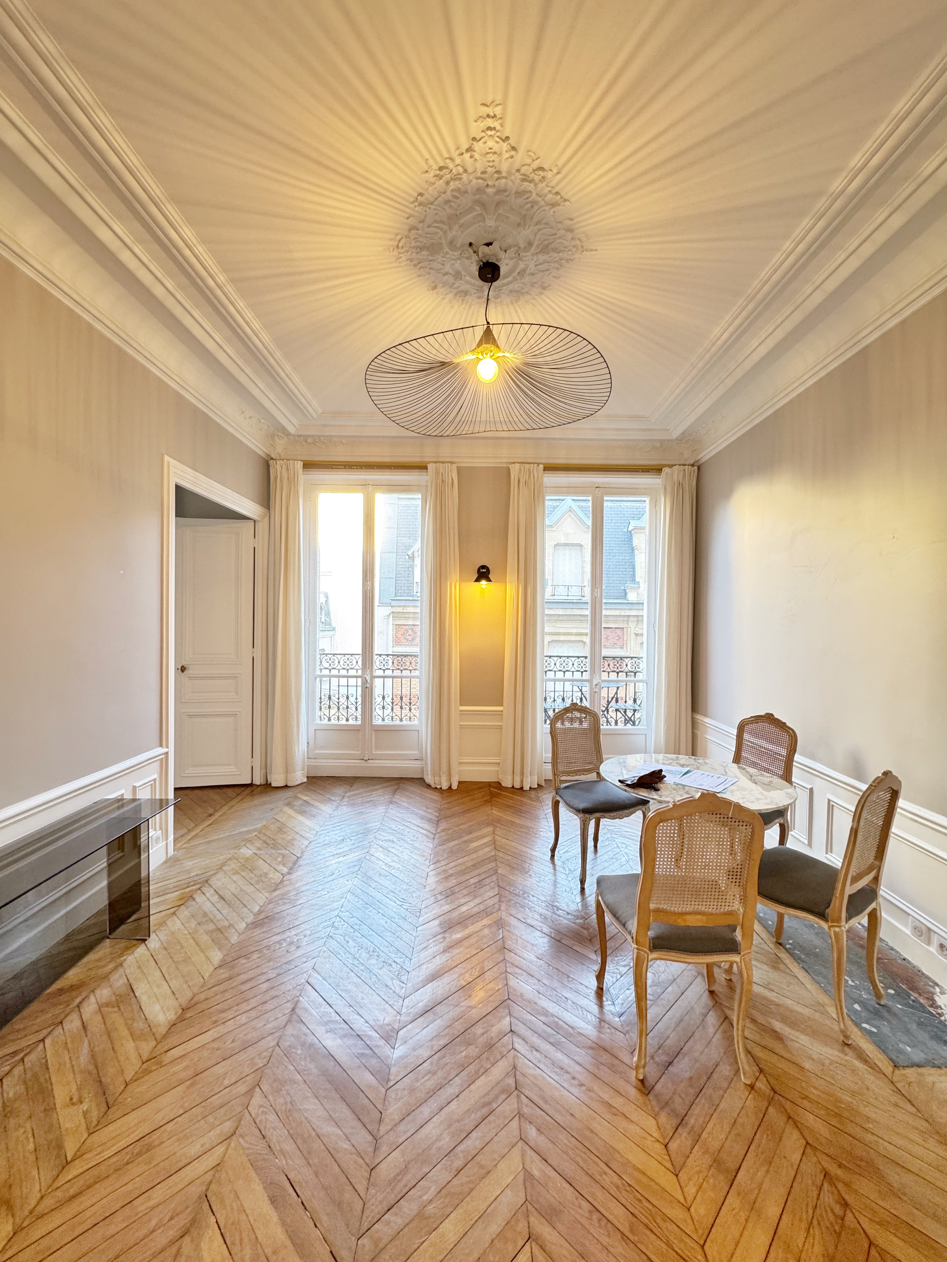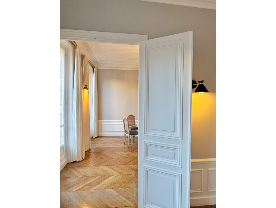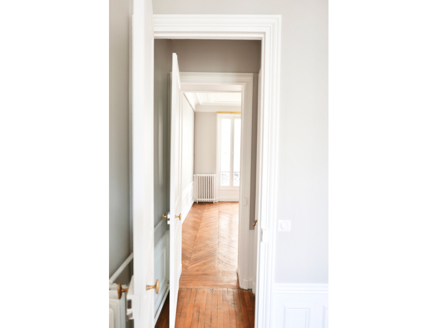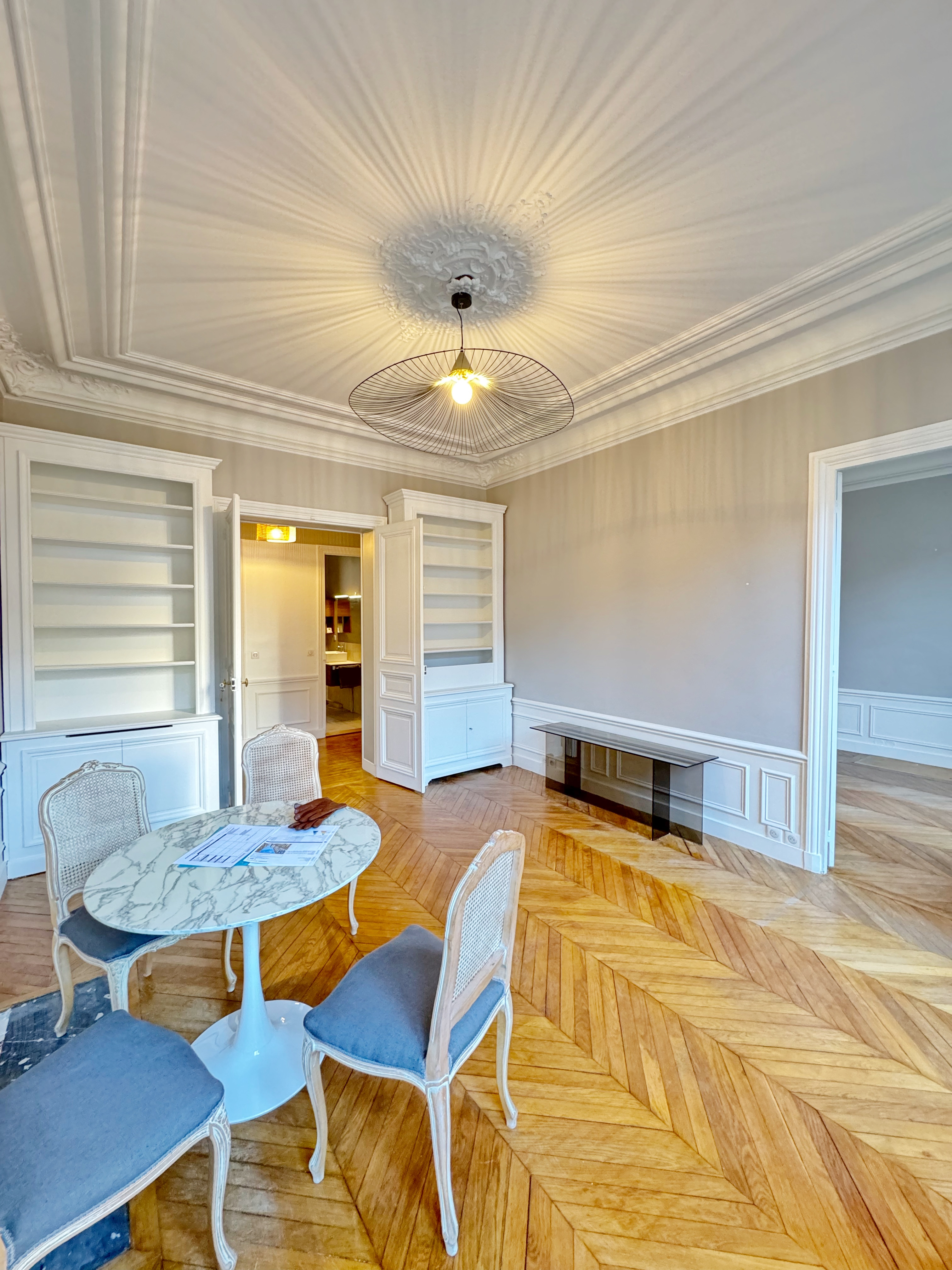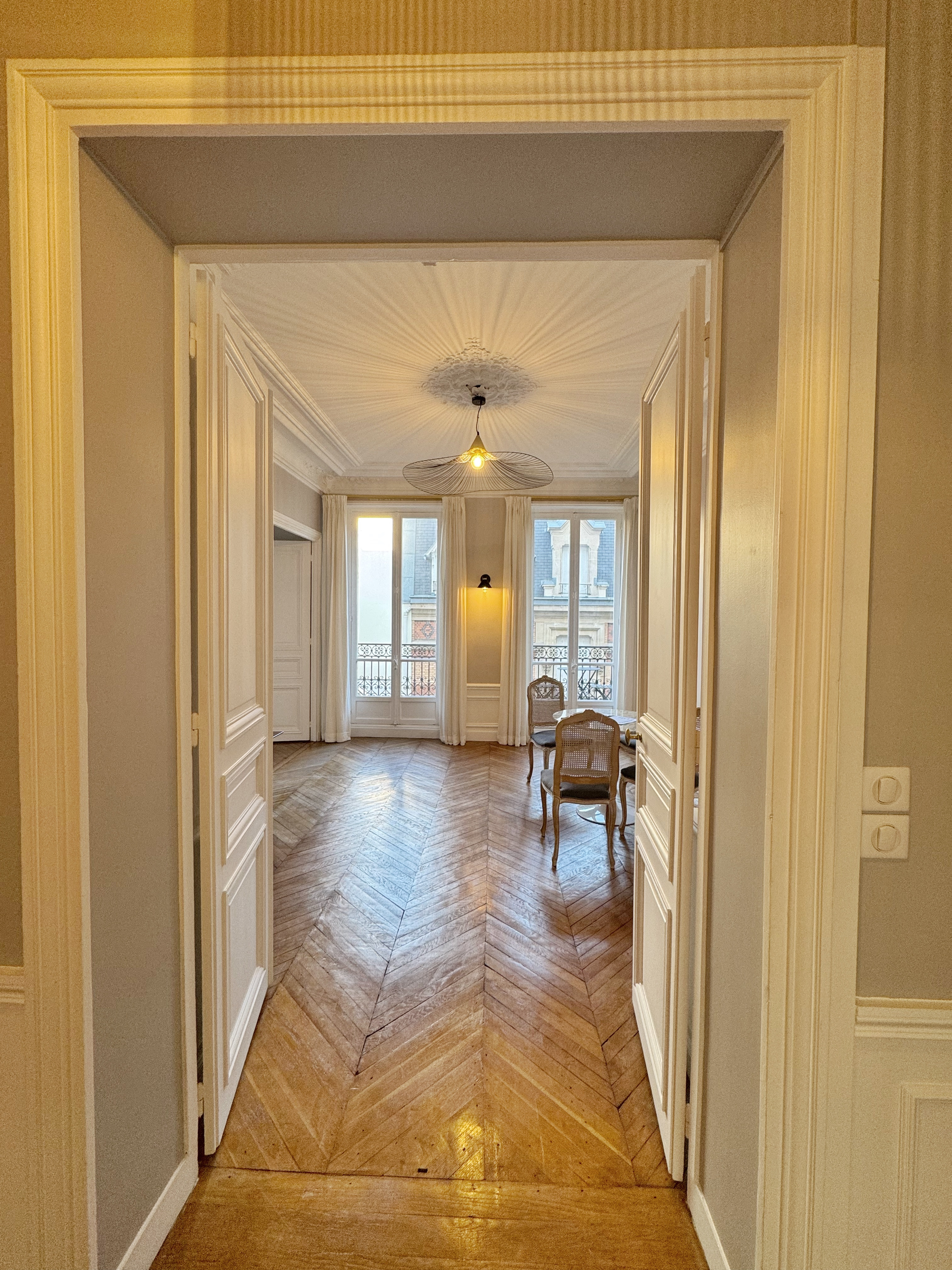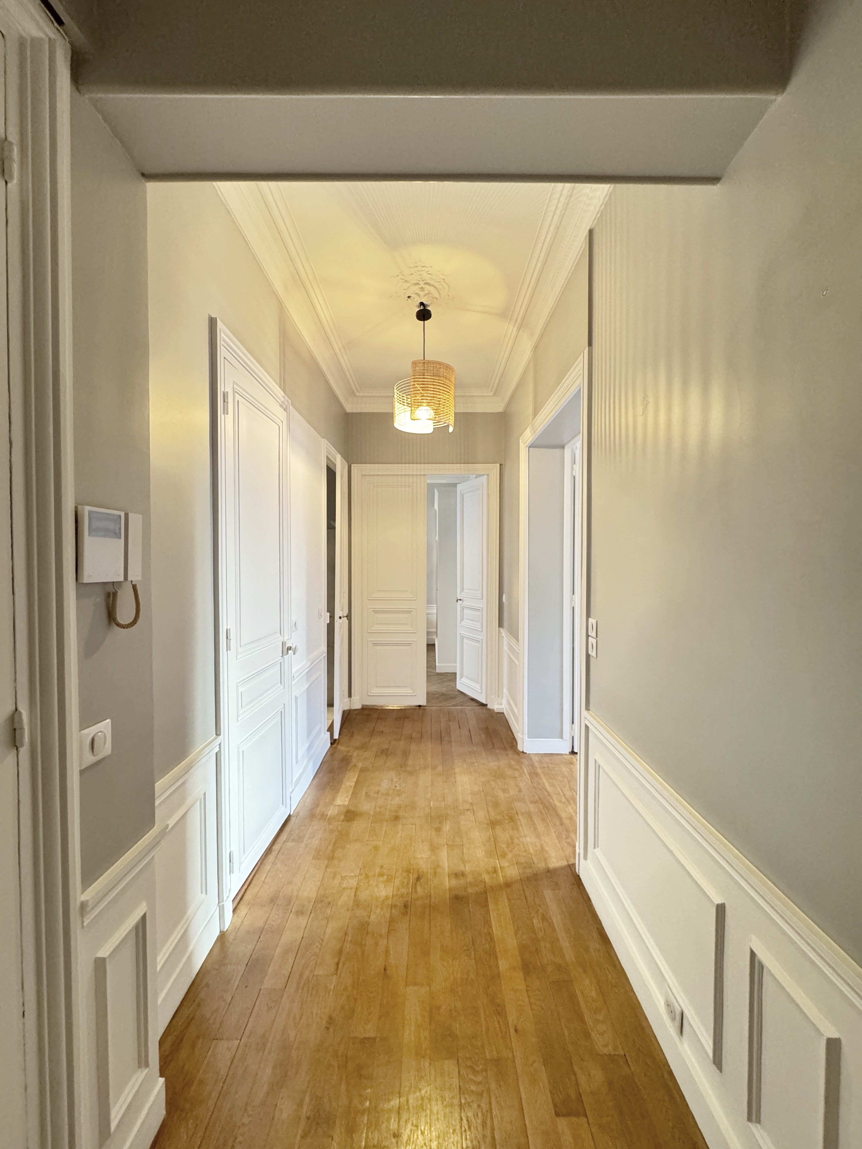 3 pièces de 68 m2 composé d'une galerie d'entrée, un séjour avec balcon sur l'impasse, une cuisine toute équipée, deux grandes chambres avec placards et dressing, une salle de douche avec machine LL et sèche linge + WC. Parquet, moulures, belle hauteur sous plafond