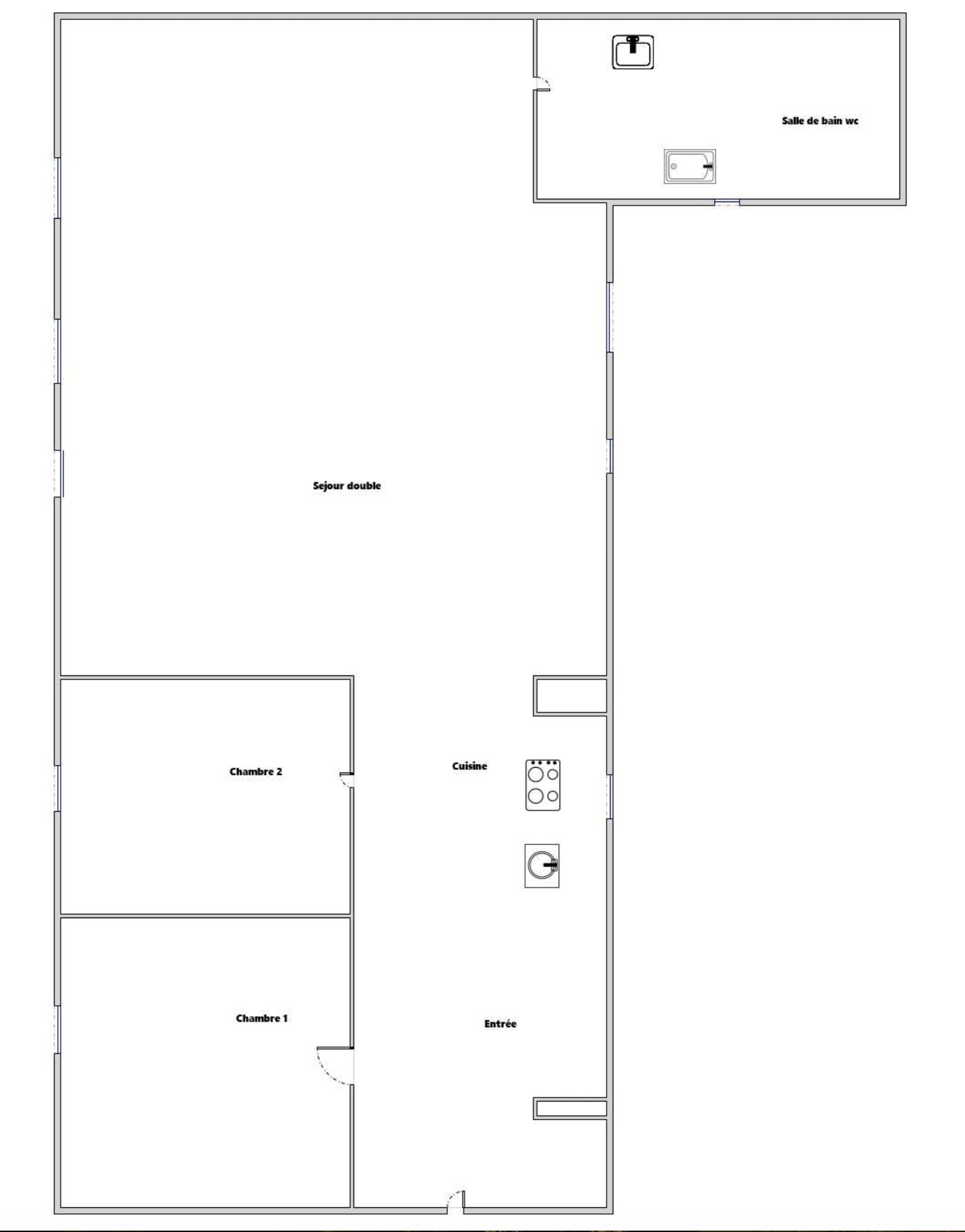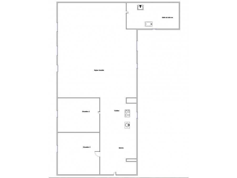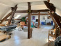 Entrée, cuisine US, vaste séjour (54 m2 au sol) traversant avec poutres et cheminée, deux chambres (possibilité de cloisonner une 3ème), salle de bains avec WC.